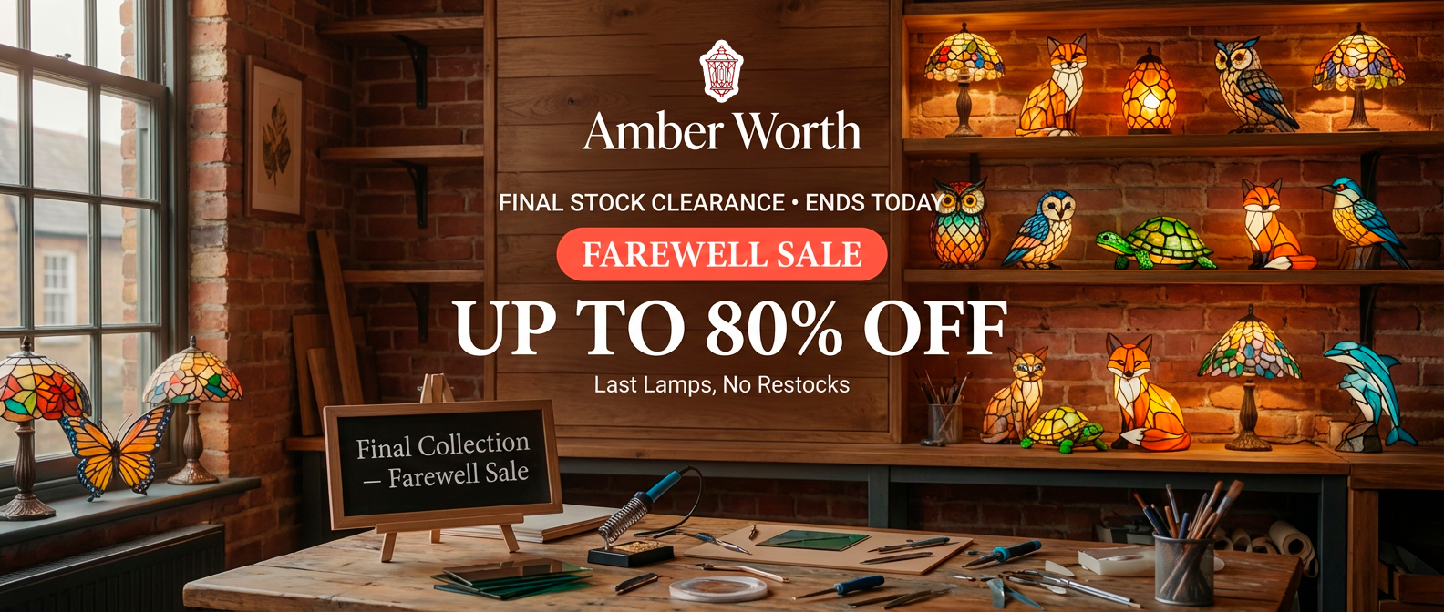 Every lamp is genuinely handcrafted using premium stained glass. Each piece involves hours of hand-cutting, soldering, and finishing by skilled artisans. The colours, textures, and light patterns are unique to every lamp — no two are exactly alike. These are the very same lamps we've been selling at full price; the only difference now is the farewell pricing.